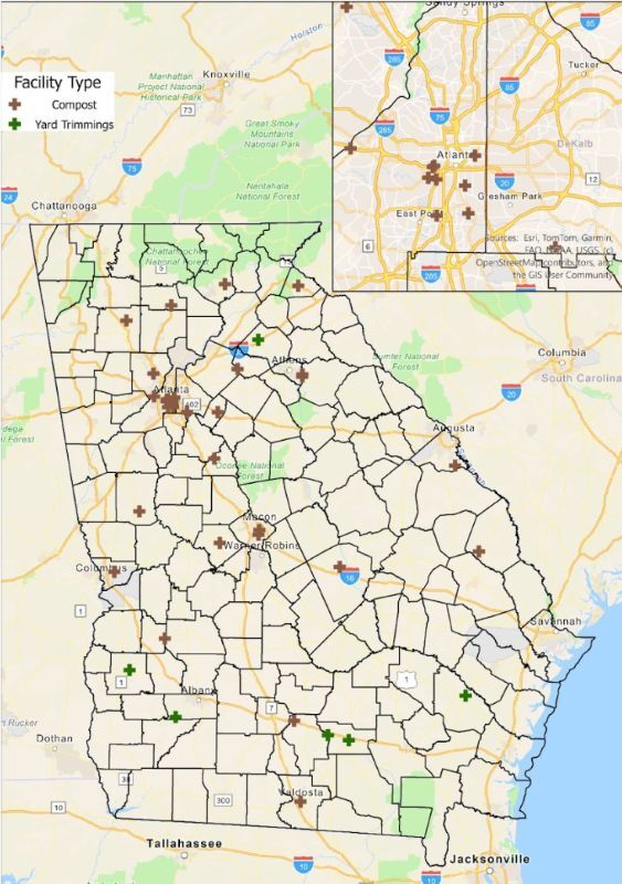 Georgia has composting facilities distributed throughout the state, with varying scales and capabilities. The new interactive map shows the locations of permitted composting operations, collection sites, and drop-off locations.